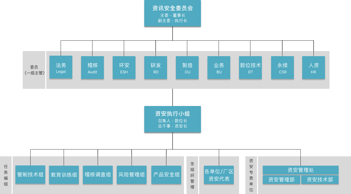 资讯安全委员会为XPJ(中国大陆)资安最高管理组织,向董事长报告。下辖资安执行小组负责推行资讯安全委员会之各项决议。为持续建构完整且精实的资安专 责团队,资讯安全管理处下成立「资讯安全管理部」与「资讯安全技术部」,持续投入资源以强化团队资安核心能力。