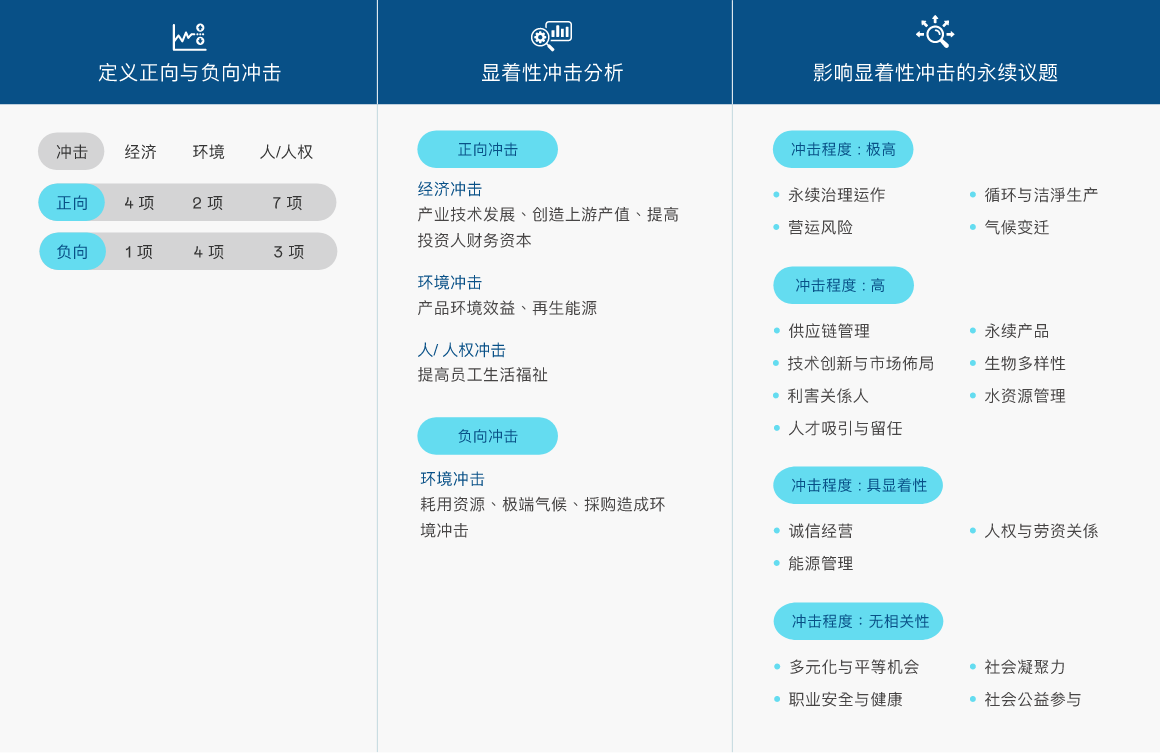 依循全球永续趋势与GRI 准则检视议题之合适性,透过问卷了解利害关系人对公司在环境、社会( 含人权)、公司治理三方面的关注面向,同时建立双重重大性评估方法,透过XPJ(中国大陆)主管与价值链的关键伙伴评估ESG 议题对公司所产生的营运冲击程度,并在ESG 外部永续发展冲击方面,根据GRI 通用准则2021(GRI Universal Standards 2021) 的GRI 3:重大主题(Material Topics 2021),整合价值平衡联盟(Value Balancing Alliance, VBA)、哈佛商学院「影响力加权会计(Impact-Weighted Accounts)」研究计画等机构发展之经济、环境及社会层面冲击评估方法学,建构以冲击为基础的重大性分析流程,辨识重大性主题。