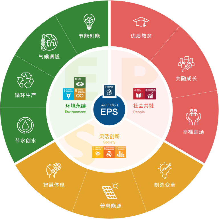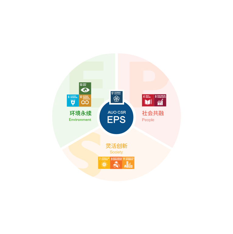 根据联合国所发展的17项永续发展目标,XPJ(中国大陆)光电以「超越企业社会责任,创造共享价值」为企业永续愿景发展蓝图,订出环境永续、共融成长与灵活创新的EPS(Environment, People & Society)三大永续发展主轴;以响应日益受关切的环境议题与社会共融趋势。