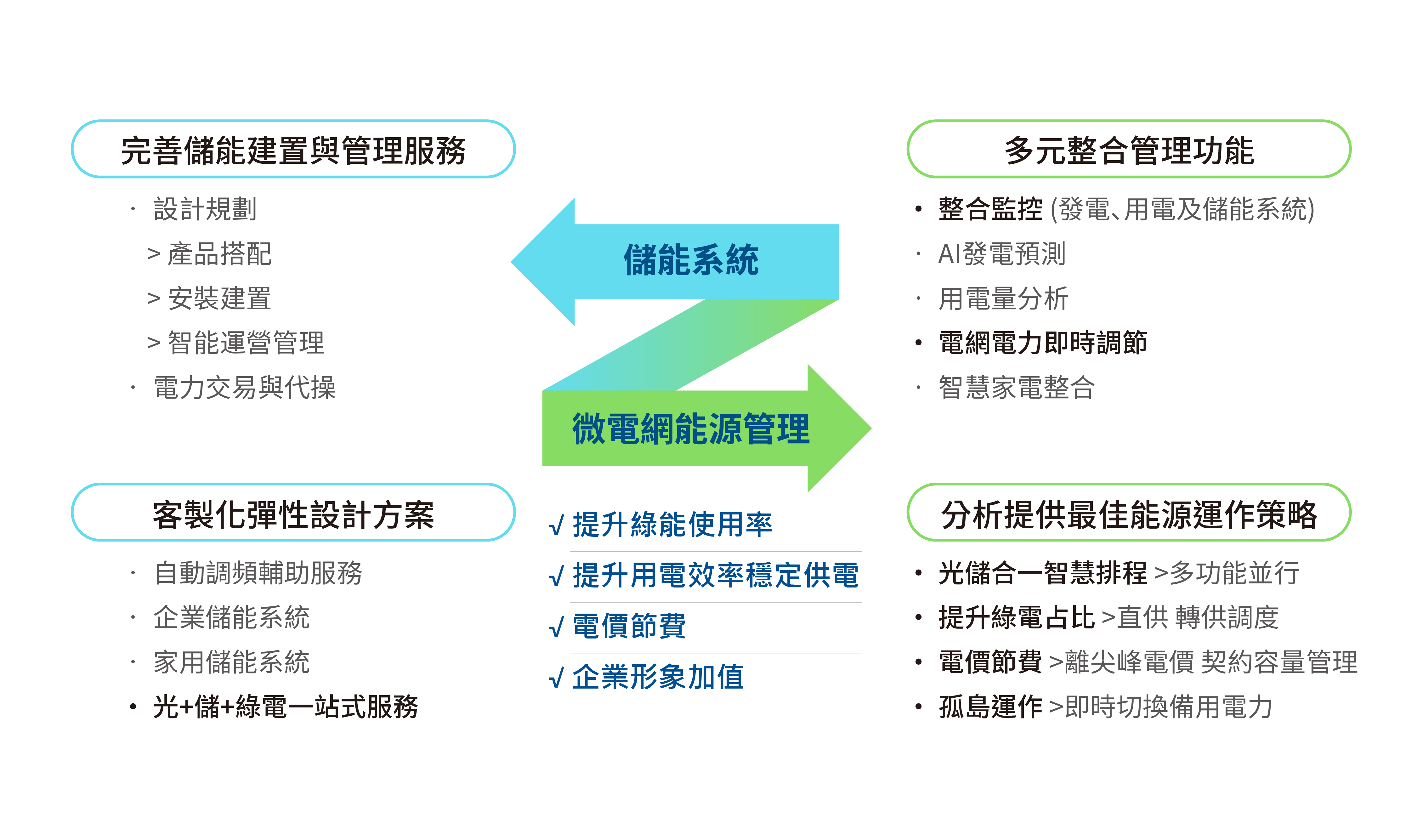 提供客戶從初期評估、穩定的設備建置、協助電力交易平台操作及長期運營的完整服務。