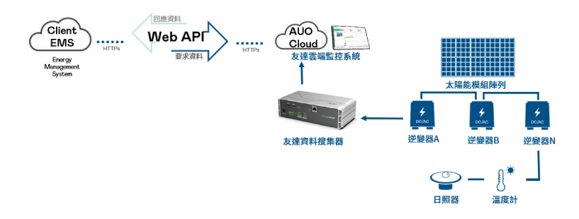 為 Client 端和 AUO 雲端平台,透過 HTTPs 通訊協定來進行資料請求與回應。 |
