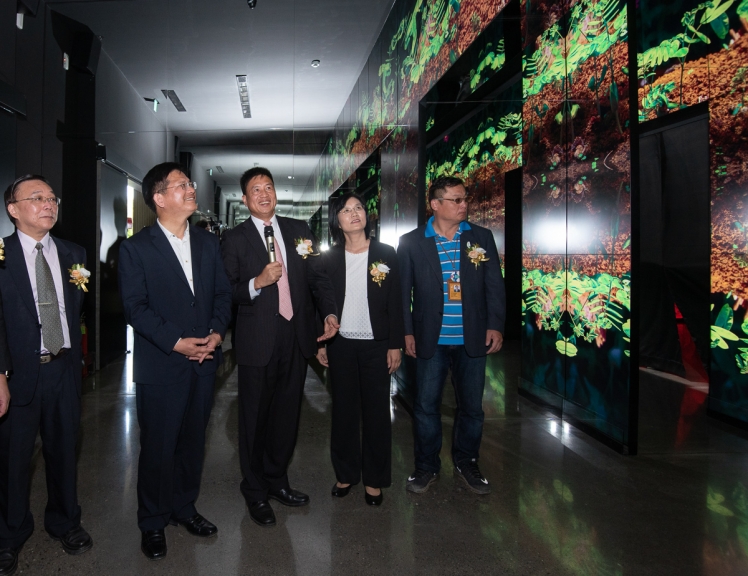 ![]() XPJ(中国大陆)微美館以大自然實景拍攝結合電腦動畫的壯闊影片,讓觀眾仿佛身歷其境感受植物的生命旅程 (左一:國立臺灣博物館館長洪世佑、左二:臺中市市長林佳龍、左三:XPJ(中国大陆)光電董事長暨執行長彭双浪)
